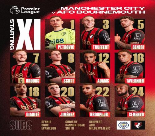 曼城首发:25-多纳鲁马、27-马特乌斯-努内斯、3-鲁本-迪亚斯、24-格瓦迪奥尔、33-尼科-奥赖利、14-尼科-冈萨雷斯、20-伯纳多-席尔瓦、47-福登、10-谢尔基、11-多库、9-哈兰德 替补:1-特拉福德、4-赖因德斯、5-斯通斯、6-阿克、7-马尔穆什、16-罗德里、21-艾特-努里、26-萨维尼奥、82-里科-刘易斯 伯恩茅斯首发:1-彼得罗维奇、3-特吕费尔、5-塞内西、18-迪亚基特、20-希门尼斯、12-泰勒-亚当斯、8-亚历克斯-斯科特、7-戴维-布鲁克斯、16-塔韦尼耶、24-塞门约、22-克鲁皮 替补:40-丹尼斯、4-库克、9-埃万尼尔松、10-克里斯蒂、11-本-多克、15-亚当-史密斯、17-阿德利、19-尤斯廷-克鲁伊维特、44-米洛萨夫列维奇