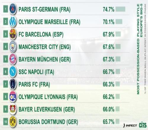 “足球天文台”(CIES)公布欧洲五大联赛球队“阵地进攻”和“转换进攻”榜单。排名显示,法甲的巴黎和马赛最热衷于通过掌控球权发起进攻,占比超过了70%,排名三四的则是传控大师巴萨和曼城。值得注意的是,前五的球队中,瓜迪奥拉执教过巴萨、拜仁、曼城三支球队,恩里克和弗利克也执教过其中两支,拜仁主帅孔帕尼在曼城师承瓜迪奥拉,拜仁当初选择孔帕尼,也是得到了瓜帅的充分肯定。可以说,瓜迪奥拉主义目前仍是菁英足球世界的顶层哲学源头。