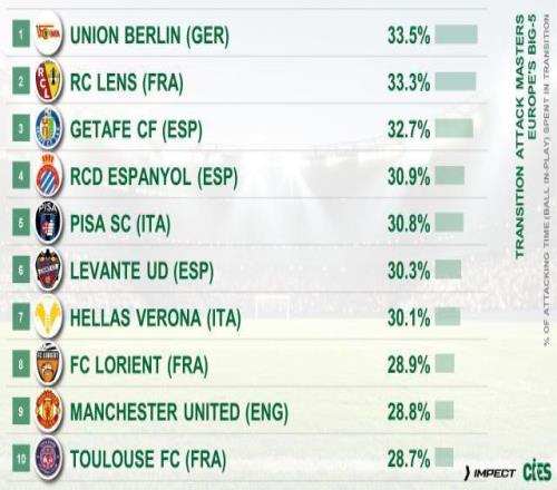另一个榜单是最热衷转换进攻的球队,虽然转换进攻与传统的防守反击并不能完全划等号——转换进攻强调由守转攻的过程,但不一定是消极蹲守,也可以是阵型前压,在中前场就展开逼抢。但总的来说,防守反击也属于转换进攻,而我们也可以看到这个榜单前十几乎一水是各联赛的中下游球队,唯独排名第九的曼联成了豪门“显眼包”。当然,战术本无高低优劣之分,黑猫白猫,能抓老鼠就是好猫。朗斯目前法甲第三(上赛季第八),靠的是联赛防守第二好的表现,相比同分的马赛他们进球不多,反而是错失进球机会的数据法甲第一,这也说明了他们的确通过转换进攻获得了大量机会。