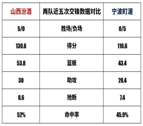 山西汾酒与宁波町渥历史上一共交手9次,山西汾酒8胜1负。上赛季两队交手2次,山西汾酒2胜0负;本赛季两队交手1次,山西汾酒1胜0负。