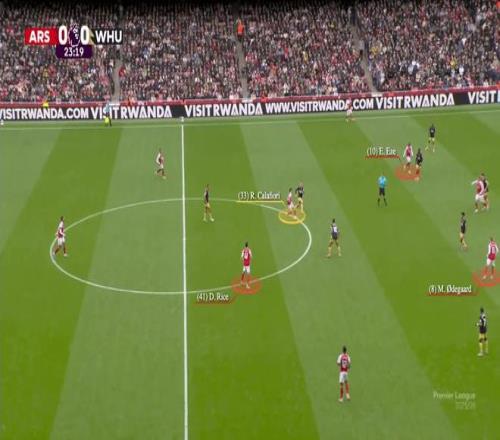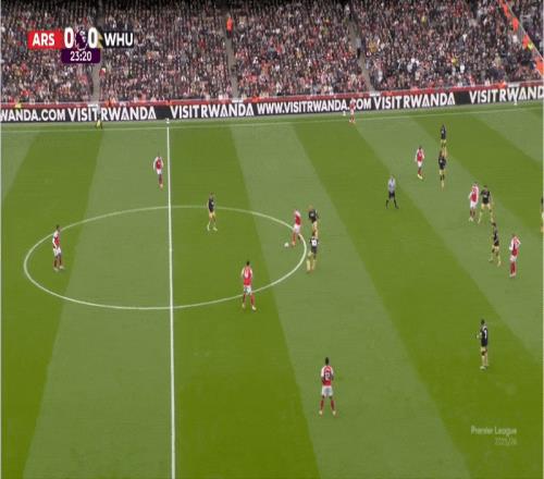 ……但他游弋到右肋区域,在那里形成人数优势。卡拉菲奥里的移动迫使马特乌斯-费尔南德斯离开对厄德高的盯防,这又使得西汉姆的左中卫基尔曼必须保持一个更高的位置来跟防阿森纳队长。