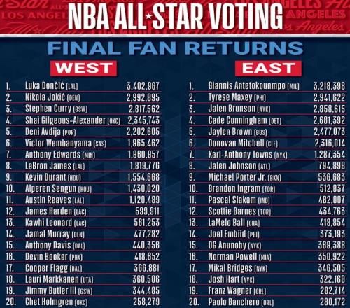 北京时间1月20日,NBA官方公布了最终的全明星球迷投票,快船的莱昂纳德561253排在第13,快船的哈登599911排在第12。